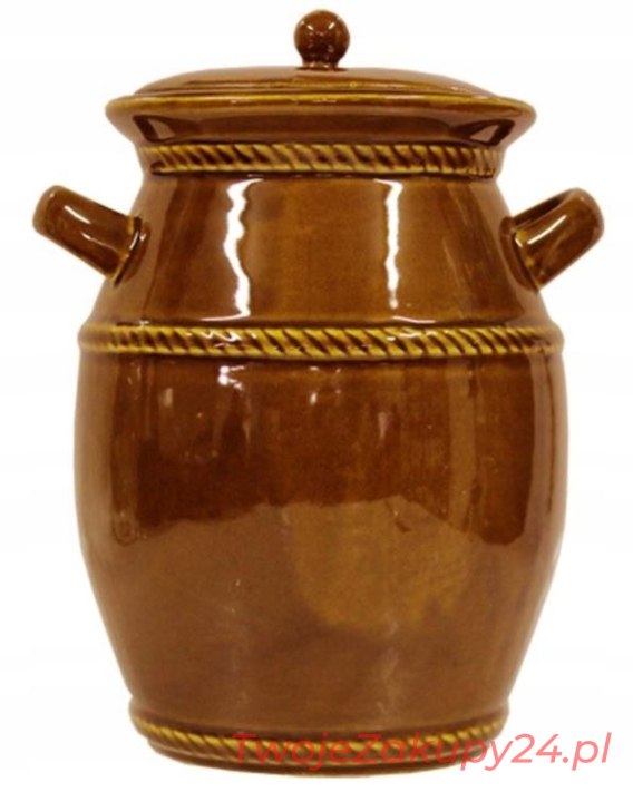 KLASYCZNY I TRADYCYJNY GARNEK CERAMICZNY Najlepsza jakość na rynku ! Uniwersalny. Idealny do ogórków, smalcu ale nie tylko... Praktyczny, a także może służyć jako dekoracja. Posiada pokrywkę i uchwyty. Materiał: ceramika - kamionka Artykuł jest nowy i w oryginalnym opakowaniu. POJEMNOŚĆ 4 L WAGA 2,4 kg ŚREDNICA 18 cm WYSOKOŚĆ 28 cm Szanowni Klienci Przechowywanie warzyw w garnkach ceramicznych to sprawdzona, a zarazem najlepsza metoda utrzymania ich świeżego zapachu i dobrego smaku. Inaczej niż w przypadku przetworów pasteryzowanych w słoikach wecka, żywność przechowywana w naczyniach ceramicznych nie traci swoich wartości odżywczych. W okresie zimowym kiszona kapusta lub kiszone ogórki z garnka ceramicznego to niezastąpione źródła naturalnych witamin. Garnek ceramiczny przeznaczony jest do długotrwałego przechowywania żywności w warunkach ekologicznych, bez użycia konserwantów . Doskonale nadaje się do kiszenia ogórków, kwaszenia kapusty, peklowania mięsa, przechowywania smalcu. Charakteryzuje się wysoką jakością , funkcjonalnością i estetycznym wykonaniem. Metoda użycia garnka hermetycznego i sposób przechowywania przetworów Wkładając pokrywkę w wypełniony wodą kołnierz garnka, odcinamy dopływ powietrza do wnętrza naczynia. Umieszczone w nim warzywa fermentując, wytwarzają dwutlenek węgla, który z czasem wypiera całkowicie powietrze. W ten sposób w garnku tworzy się atmosfera beztlenowa. Dojrzewające w niej przetwory nabywają niepowtarzalnego smaku. Uzupełnianie poziomu wody w kołnierzu zapobiega utracie szczelności zamknięcia. Dodatkowo, aby zmniejszyć parowanie wody z kołnierza, można do niego dolać nieco oleju jadalnego - w ten sposób ogranicza się częstotliwość uzupełniania wody.