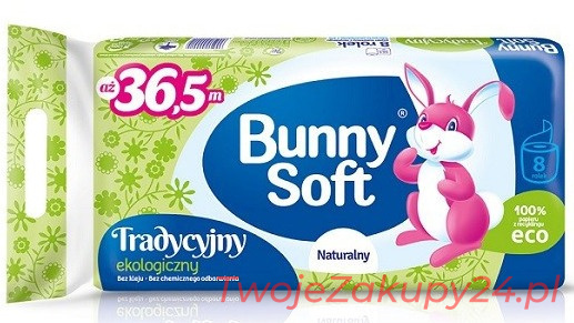 BUNNY SOFT /zając/ papier toaletowy ekologiczny opakowanie 8 rolek. Długość rolki 36,5 m, 1 warstwa.