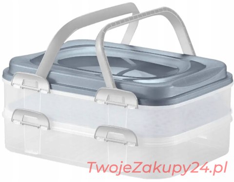 KOLOR WYSYŁAMY LOSOWO DOSTĘPNE KOLORY NA : szary różowy zielony Prostokątny, dwupiętrowy pojemnik Dolce z pokrywą w kolorze niebieskim. Produkt marki Domotti. Użyteczny pojemnik do przechowywania, transportu i serwowania wypieków. Dzięki niemu wypieki, kanapki i przekąski dłużej zachowają świeżość. Wyposażony w praktyczne, składane uchwyty ułatwiające przenoszenie pojemnika oraz klipsy zabezpieczające pojemnik przed otwarciem. Wykonany z wysokiej jakości tworzywa sztucznego. Idealnie nadaje się na kuchenny blat, do lodówki lub do szafki.