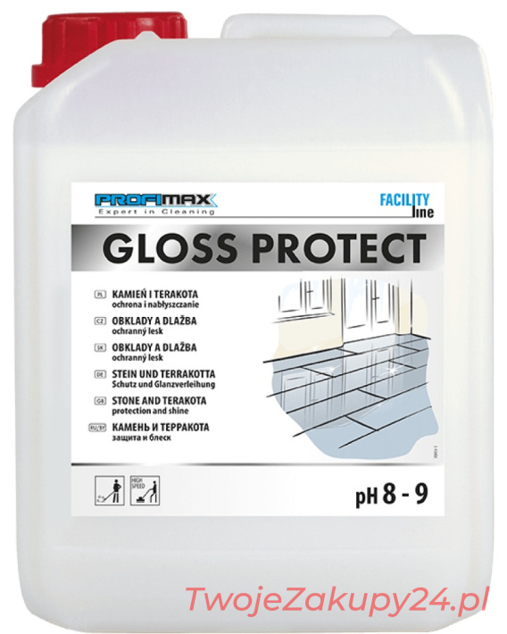 GLOSS PROTECT do ochrony i nabłyszczania kamienia i terakoty jest środkiem na bazie wysokiej jakości dyspersji styrenowo-akrylowej do konserwacji powierzchni narażonych na zniszczenia tj: posadzek marmurowych, lastrykowych, gresowych, terakoty, kamienia naturalnego oraz powierzchni z klinkieru wewnątrz jak i na zewnątrz pomieszczeń. Cechuje się bardzo wysoką przyczepnością do podłoża. Produkt gotowy do użycia